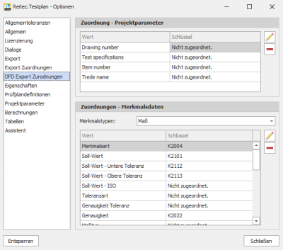 Im Bereich „DFD Export Zuordnungen“ können Sie nun definieren wie Merkmalsdaten, Eigenschaftswerte, Projektparameter und berechnete Werte den DFD Eigenschaften zugeordnet sind.