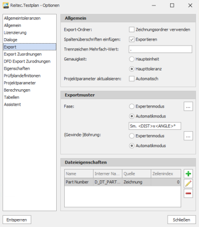 In diesem Bereich legen Sie fest, welche Dateieigenschaften exportiert werden sollen. Damit die Dateieigenschaften exportiert werden müssen Sie über den Schlüssel einem Projektparameter zugeordnet werden. Siehe Kapitel Projektparameter