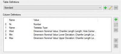 Im Bereich „Tabellen-Definitionen“ können Sie über die Schaltflächen 'Plus', 'Stift' und 'Minus' neue Definitionen erstellen, vorhandene Definitionen bearbeiten oder vorhandene Definitionen löschen.