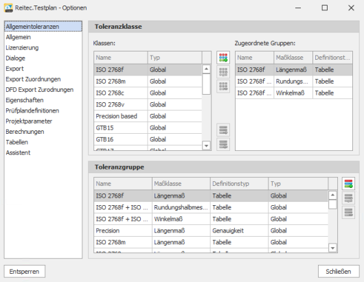 Beim Export kann für gekennzeichnete Maße ohne Toleranzangaben die allg. Toleranz berechnet werden. In diesem Bereich können Sie die Standarddefinitionen einsehen und eigene Definitionen erstellen.