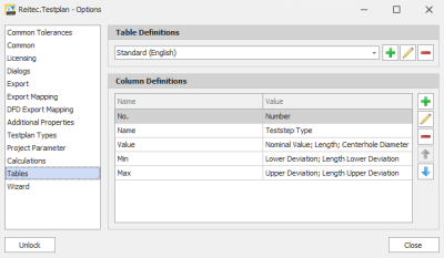 In the “Table Definitions” area you can create new definitions, edit existing definitions or delete existing definitions using the'Plus','Pen' and'Minus' buttons.