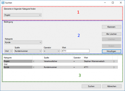 Das Suchen-Fenster ist in 3 Abschnitte eingeteilt.
