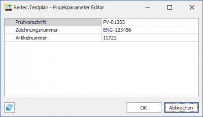 Zusätzlich zu den Daten der Prüfmerkmale können auch weitere Projektparameter wie z.B. die Zeichnungsnummer erfasst werden. Die Projektparameter werden beim Export ausgegeben und stehen bei der Prüfplanerzeugung zur Verfügung.