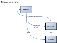By default, there are three cycle definitions: Management Cycle, Calibration Cycle, Test Cycle. Each definition consists of different status values and status transitions to change the status. The following diagrams show the default cycle definitions in detail.