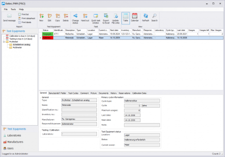 In the history of a piece of test equipment, all actions performed with the piece of test equipment are listed. Via the function “Create entry…” in the context menu (right mouse click). In the context menu (right mouse button) of the “History” tab in the detail area, you can create your own entries.