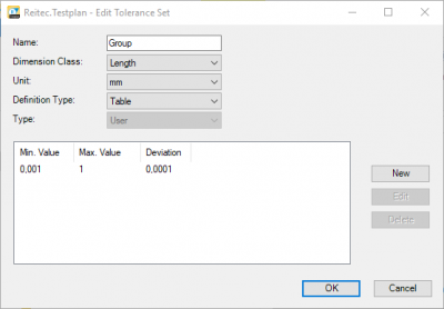 Tolerance classes combine several tolerance groups into a common tolerance. Use the buttons displayed next to the list of tolerance classes (top) to create new classes or edit or delete existing classes. In the “Edit Tolerance Class” dialog you can specify the display name.